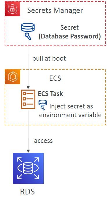 AWS ECS 서비스와 Secrets Manager는 완벽하게 연동됩니다. ECS 태스크를 시작할 때, 필요한 비밀번호와 같은 비밀 정보를 환경 변수로 받아와 내부 애플리케이션에서 안전하게 사용할 수 있습니다.