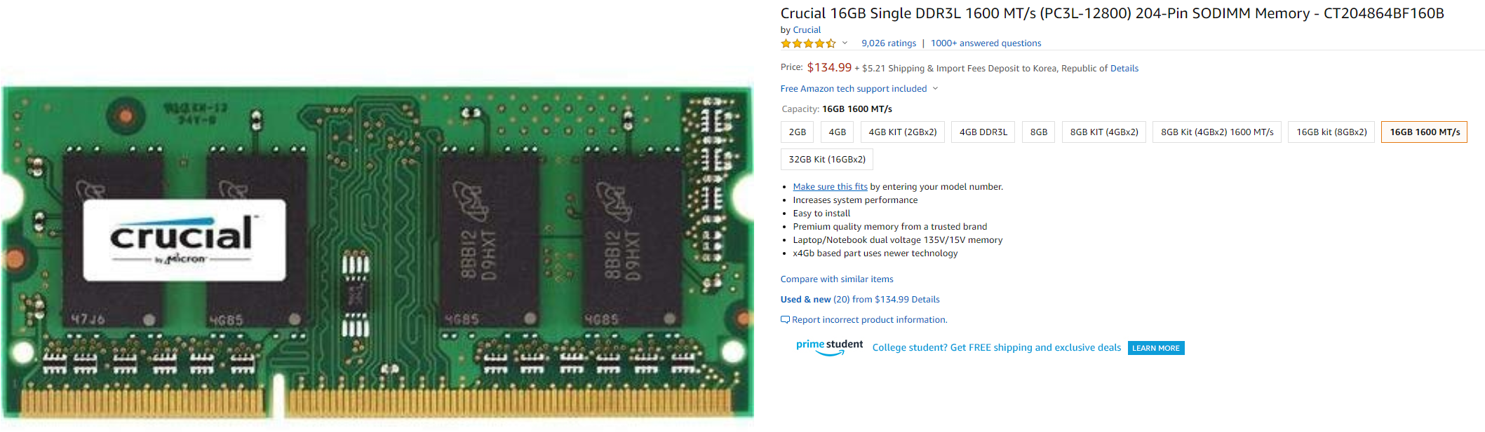 해외 샵어게인 크루셜 Crucial 16GB Single DDR3L 1600 MT/s (PC3L-12800) 204-Pin SODIMM Memory - CT20